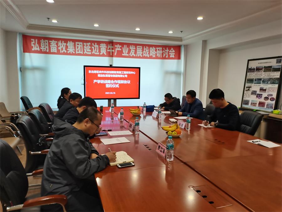 2021年3月17日下午,东北寒区肉牛科技创新教育部工程研究中心(以下简称“科技创新中心”)、科技部中国延边黄牛种质资源开发利用111引智基地(以下简称“111引智基地”)与延边弘朝畜牧集团有限公司(以下简称“弘朝畜牧集团”)产学研战略合作框架协议签订仪式于延边弘朝畜牧集团有限公司3楼举行。双方就开展延边黄牛科学技术创新研究、科技攻关等事宜达成合作意向。延边黄牛研究院院长严昌国教授、弘朝畜牧集团董事长蔡洪、总经理蔡洪范、延边大学李香子教授,高青山副教授、贾立军教授以及其他学术骨干出席签约仪式。